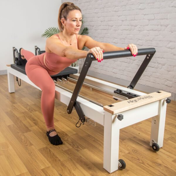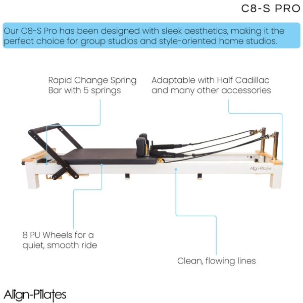 Son fonctionnement est quasiment identique à celui du C8-Pro : chariot, profil de glissière, train de roulement et systèmes de réglage identiques, pour une expérience utilisateur fluide et silencieuse. Pour les propriétaires de Reformers Pilates Série C, le C8-S Pro est équipé de la même planche de saut , du même convertisseur de matelas et de la même extension de plateforme . Le C8-S Pro est proposé en hauteur standard de 26 cm, réglable jusqu’à 42 cm grâce à ses extensions de jambes optionnelles, quasiment invisibles .