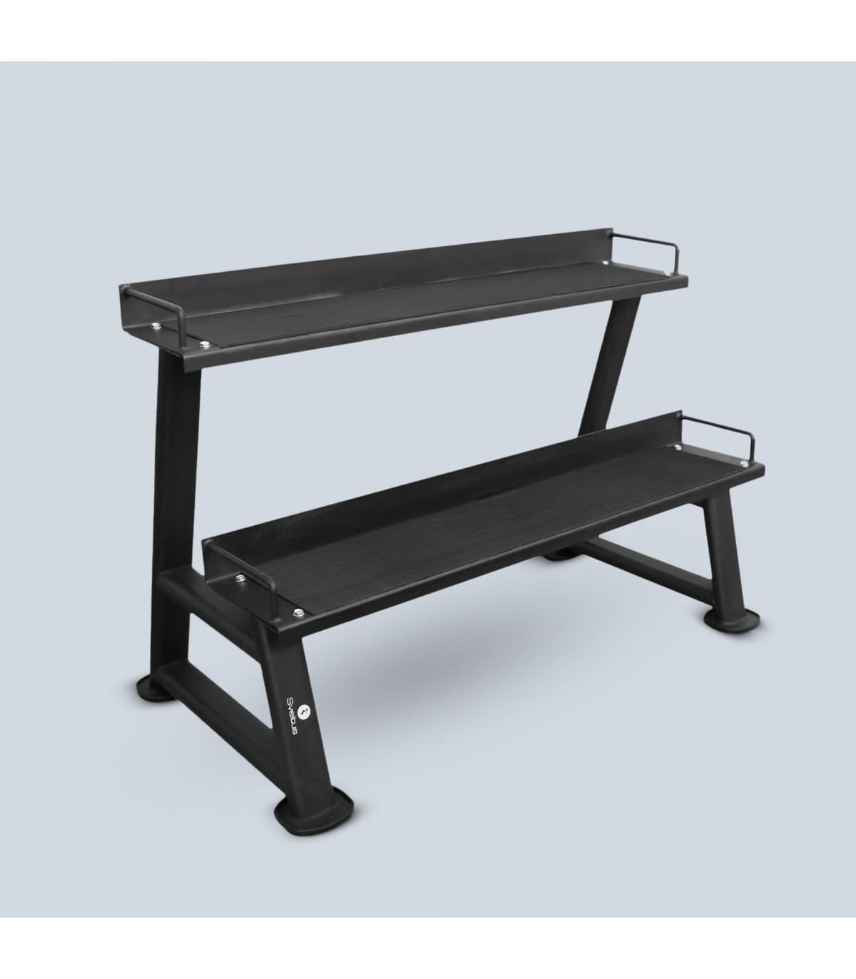 Idéal pour ranger vos kettlebells. Vous pouvez également y stocker vos haltères. Rack en acier équipé de 2 plateaux. Capacité de rangement selon la largeur de vos poids.